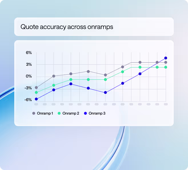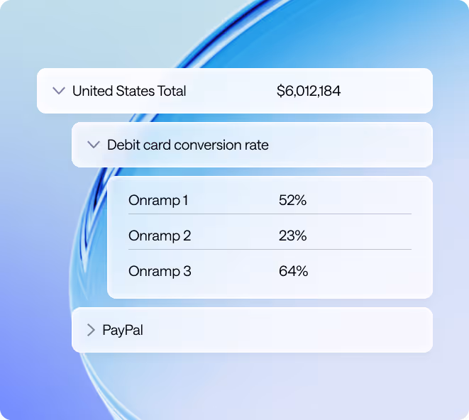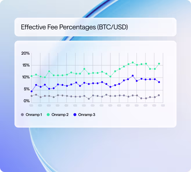 Come transaction time, our routing engine rapidly assesses your customer’s profile. By weighing up 70+ factors, it identifies the optimal onramp — not just in terms of success rates and fees, but in the easiest route to completing a transaction.